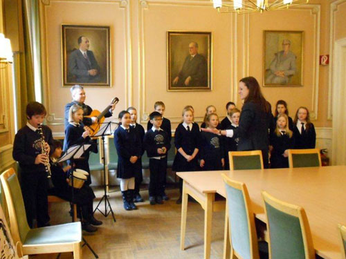 Die Kinder überreichten Dr. Bösch im Bezirksamt Zeichnungen, Plakate und eine Schulvereinstorte.