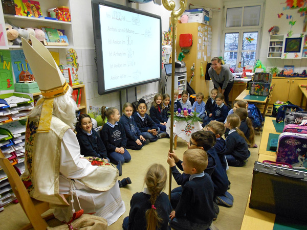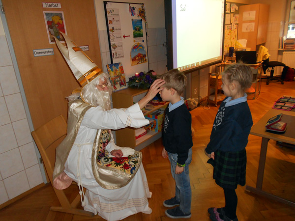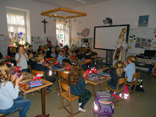 Da heuer der 6. Dezember ein Sonntag war, besuchte uns bereits am Barbaratag der Nikolaus. Die Kinder erfreuten und beschenkten ihn mit netten Gedichten und Liedern, er brachte in jede Klasse einen riesigen Sack mit Äpfeln, Mandarinen und Schokolade.