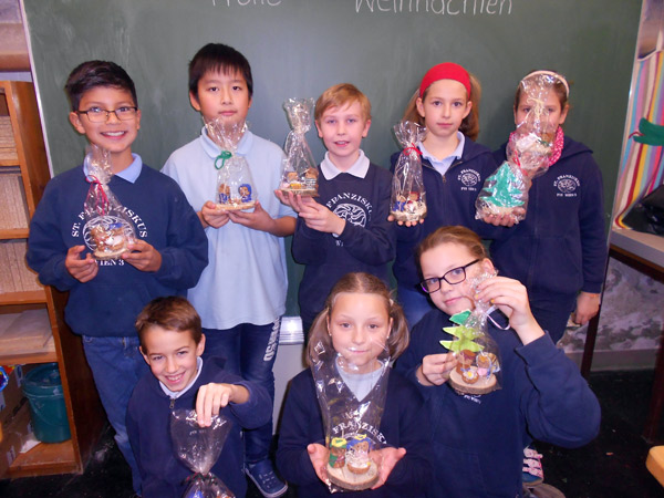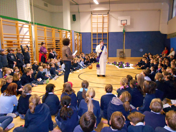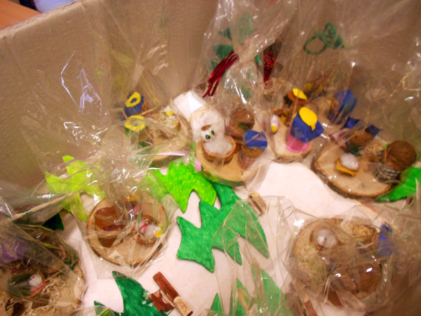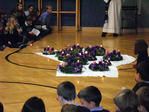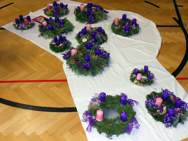 Fotos von der Adventkranzweihe und vom Krippebasteln.