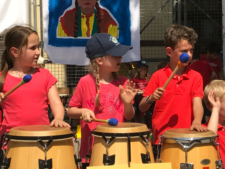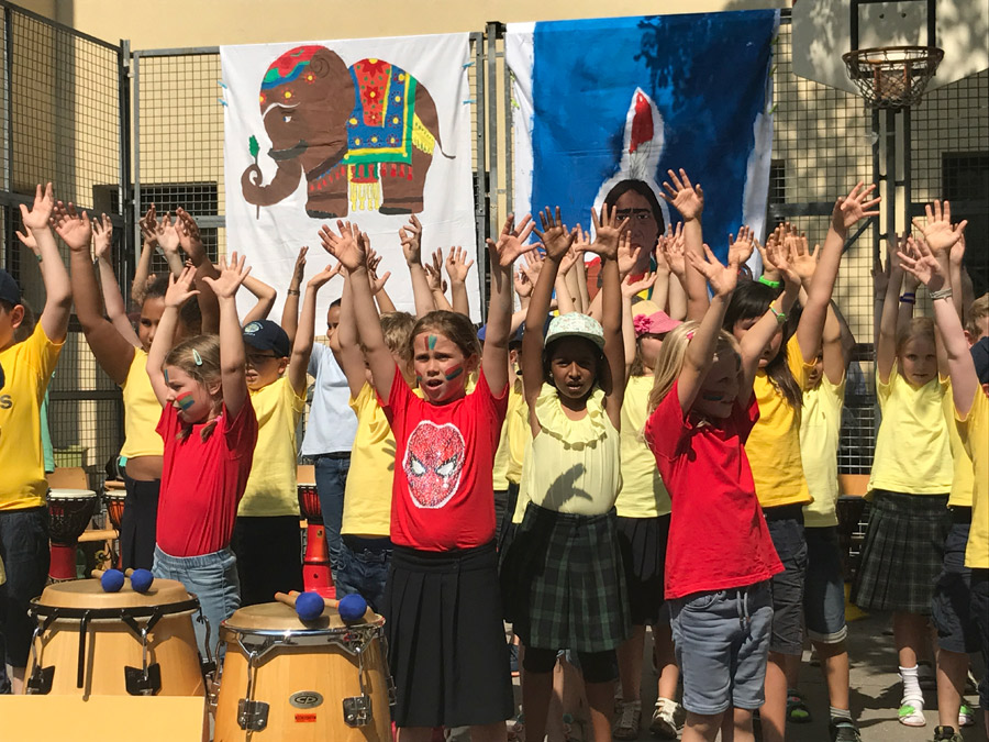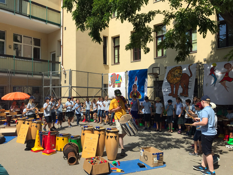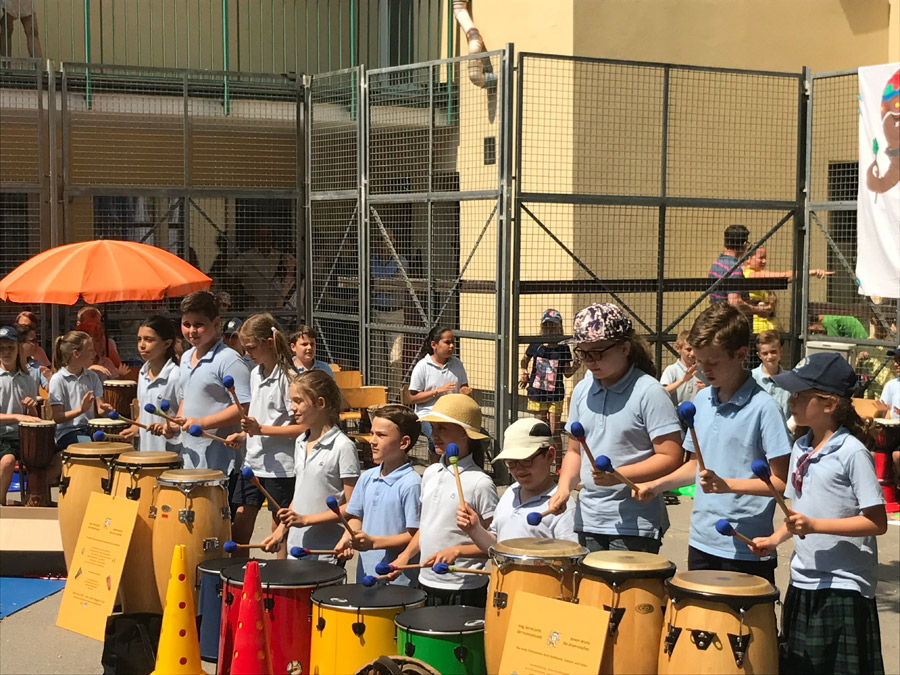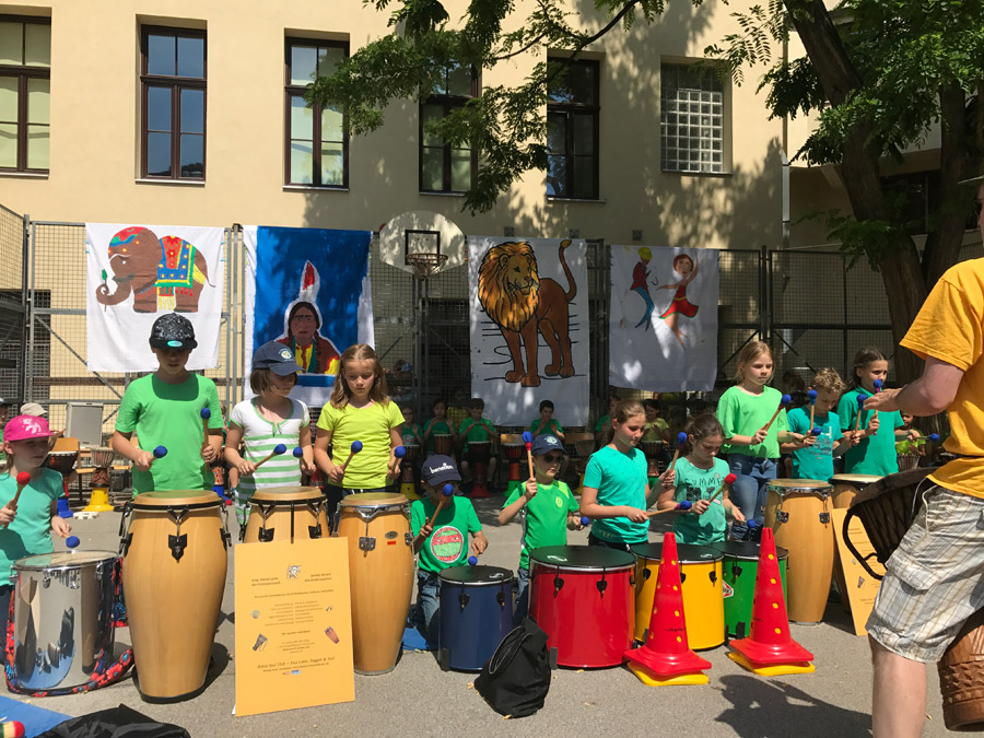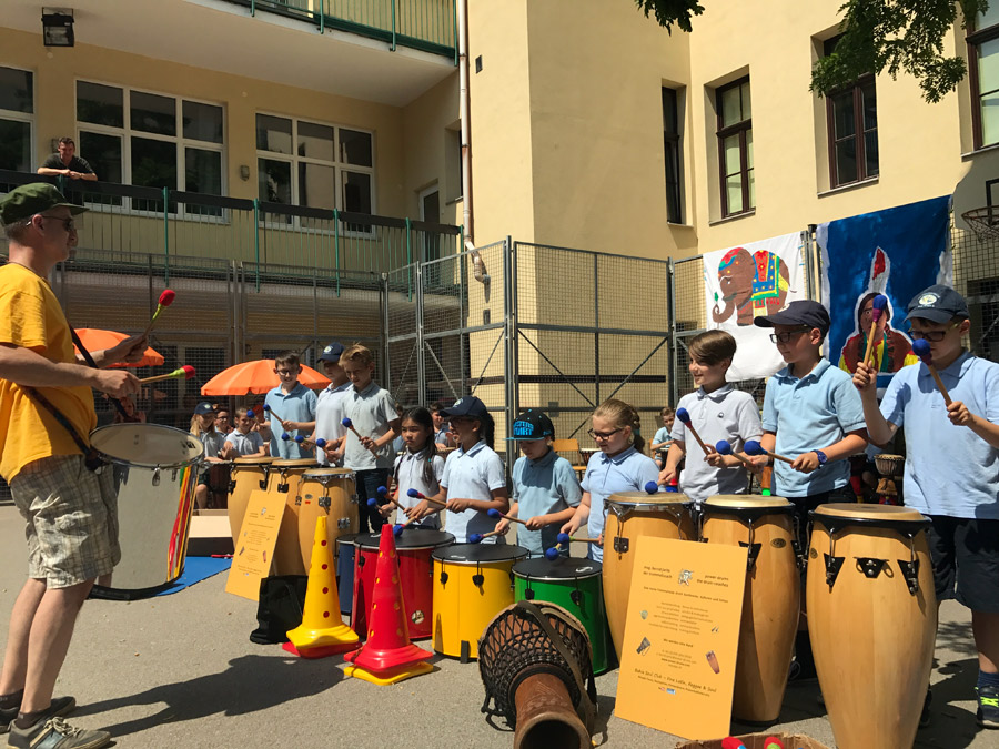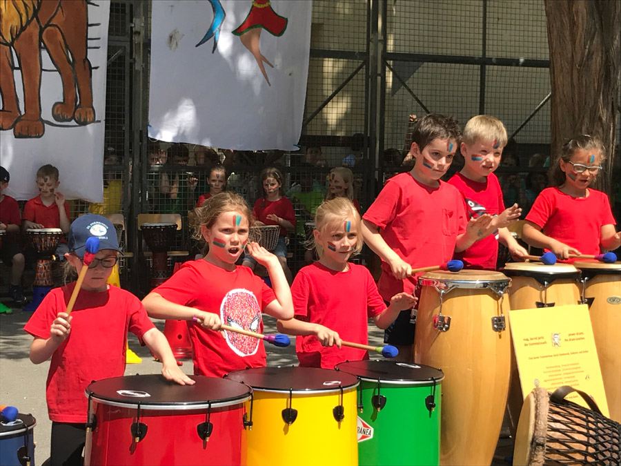 In einem vierstündigen Workshop stärkten die Kinder ihr Selbstwertgefühl, bauten Stress ab, förderten das Rhythmusgefühl, erlebten bewusst die Gemeinschaft und vor allem hatten großen Spaß. Die Trommelreise begann in Indien. Die 4. Klassen begleiteten den Prinzen auf seinem Triumphzug. Danach begaben sich die 1. Klassen nach Nordamerika, wo der Büffeltanz seinen Ursprung hat. Die 3. Klassen brachten dem Publikum mit dem „Samba Funk“, die südamerikanische Mentalität näher. Bevor es wieder nach Hause ging und unser Schulchor den musikalischen Teil des Festes abschloss, entführten die 2. Klassen die Zuschauer nach Afrika und trommelten den „Löwentanz“.