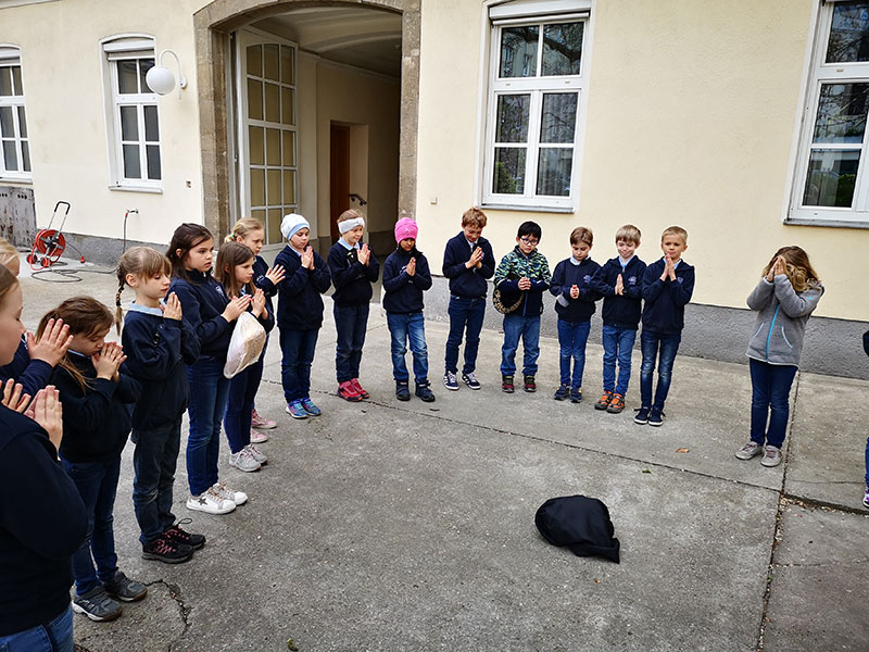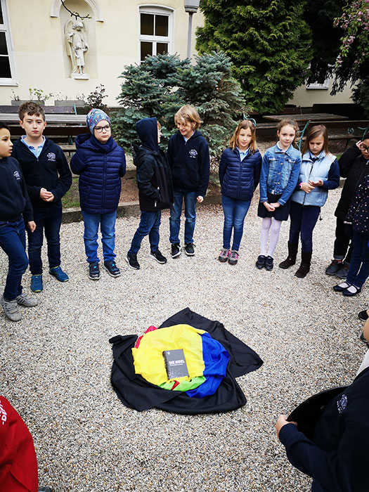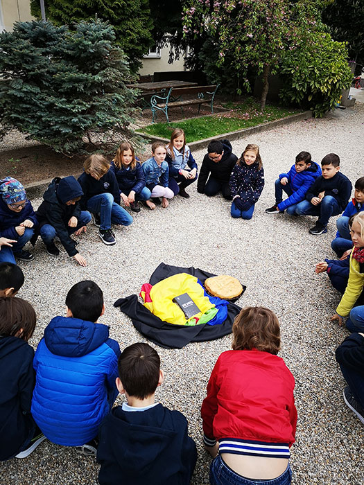 Zwei Männer gingen nach Emmaus. Sie sind traurig. Sie reden darüber, dass Jesus gestorben ist. Da kommt ein Fremder und geht mit ihnen. Es ist Jesus, aber sie erkennen ihn nicht. Er erklärt ihnen: „Jesus musste sterben und auferstehen. Die Menschen sollen verstehen: Gott ist groß. Gott liebt uns sehr.“ Sie kommen nach Emmaus.. Die Männer bitten: „Herr, bleibe bei uns, es wird bald Abend, der Tag hat sich schon geneigt.“ Jesus geht mit ihnen ins Haus. Sie setzen sich zum Essen nieder. Da nimmt Jesus das Brot und dankt Gott dafür. Er bricht es auseinander und gibt es ihnen. Da erkennen sie ihn. Es ist Jesus. Die Männer gehen zurück nach Jerusalem und erzählen allen weiter, was sie erlebt haben.