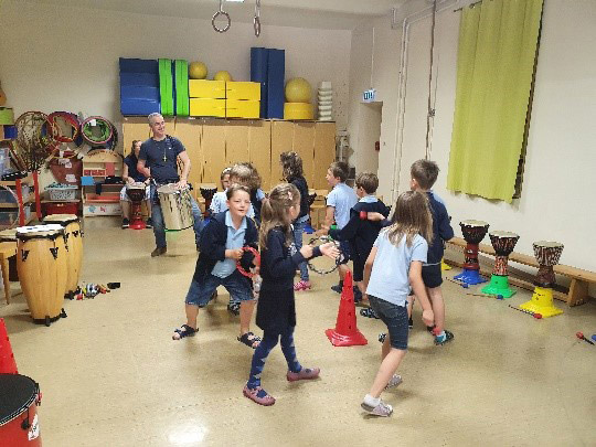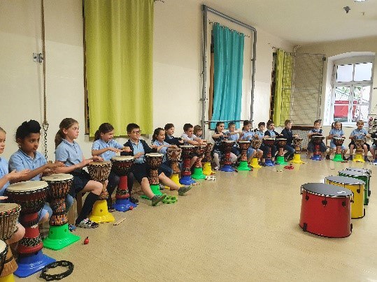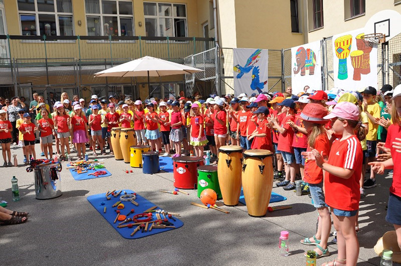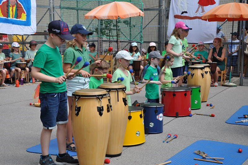 Trommelworkshops für alle Klassen mit Präsentation des Gelernten im Rahmen des Abschlussfestes am 28. Juni. Eine bunte Trommelreise durch Kontinente, Kulturen und Zeiten“ – Unsere Franziskuskinder als Trommelband tauchten mit ihrem Publikum in die Welt von Rhythmus, Tanz und Gesang ein.