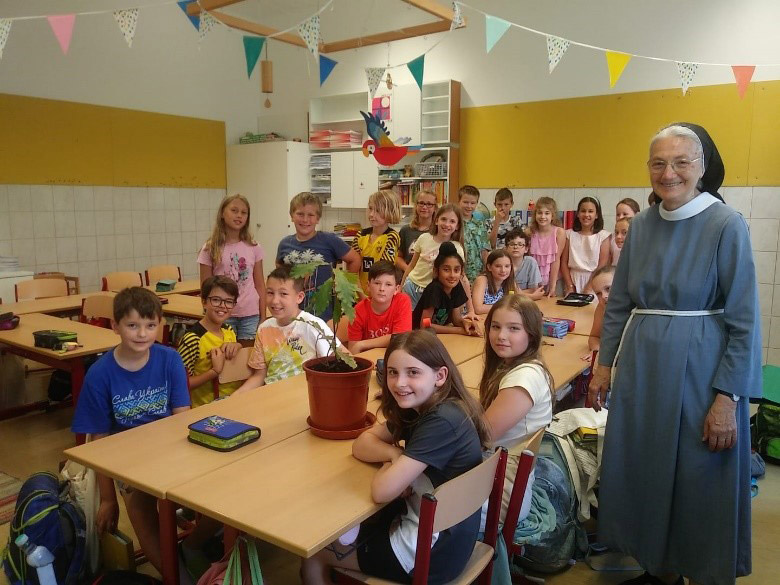 Die 4a-Kinder überreichten Sr. Petronilla ihren „Klassenbaum“. Sie pflegten und hegten ihren selbstgezogenen Baum mit viel Liebe und nun findet er, zur Freude aller, einen Platz im Garten der Schwestern im 13. Bezirk.