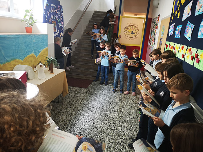 Wir lesen eine Bibelstelle und betrachten dazu die Bibelfiguren im Schuleingangsbereich