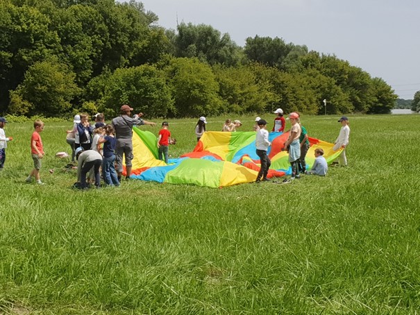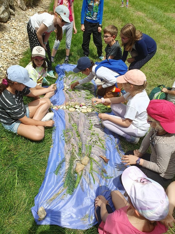 Nachdem wir unsere Sammelaktionen abgeschlossen hatten, wartete der nächste Programmpunkt auf uns: Spiele in und mit der Natur. Wir spielten verschiedene spannende Gemeinschaftsspiele, die nicht nur viel Spaß machten, sondern uns auch die Natur näherbrachten. Ob es nun Kunst in und mit der Natur, Umweltquiz oder Bewegungsspiele waren – für alle war etwas dabei. Dabei ließen wir uns auch von den zahlreichen Gelsen nicht aufhalten, die uns mit ihrem Summen begleiteten.