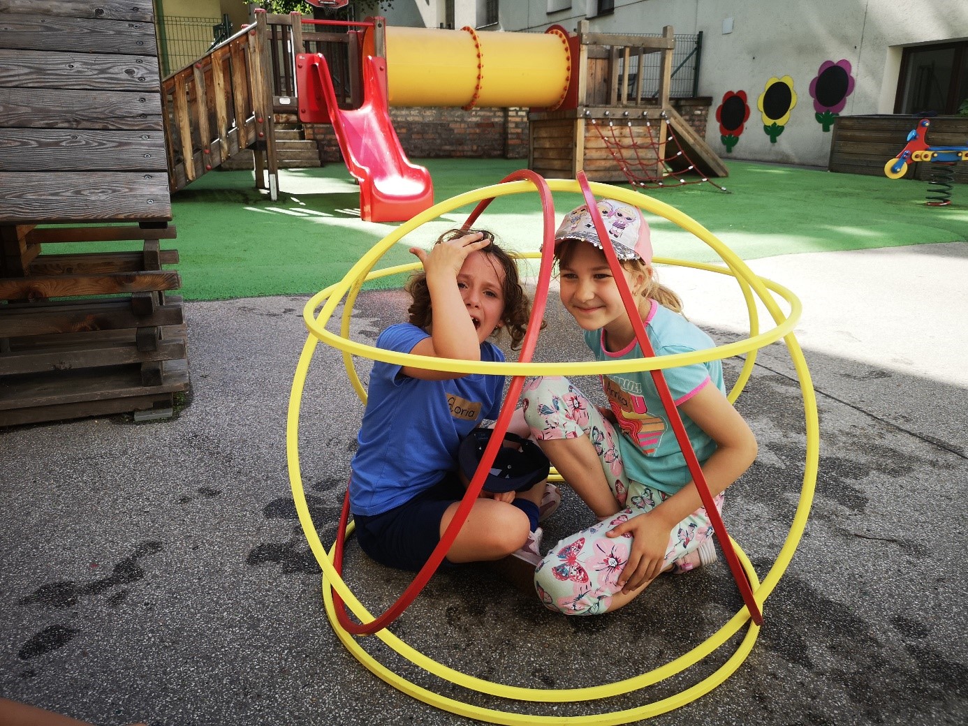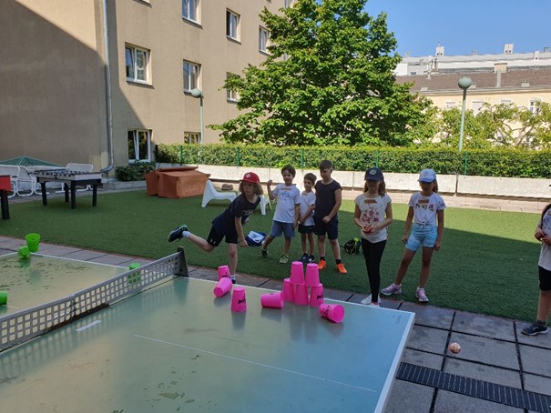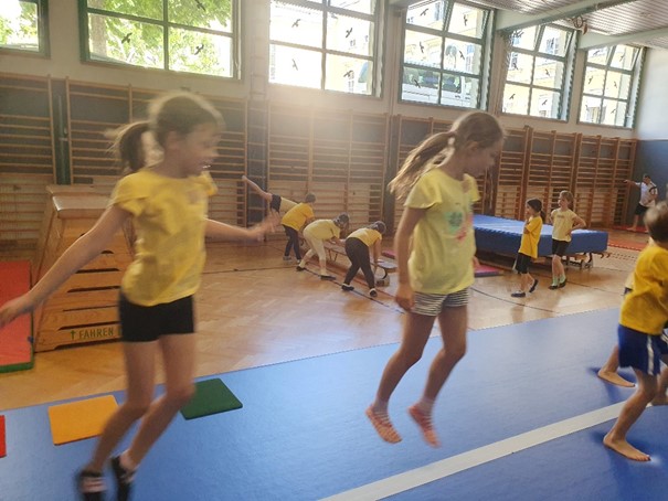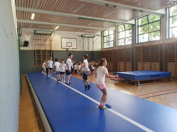 Draußen in den Schulhöfen gab es eine Vielzahl an Aktivitäten, die für jeden etwas boten. Zum Beispiel Dosen schießen, bei dem die Kinder ihre Treffsicherheit testen konnten. Beim Tempelhüpfen waren Geschicklichkeit und Balance gefragt, während der Kletterparcours alle Mutigen herausforderte. Die Schüler:innen meisterten die unterschiedlichsten Stationen mit Bravour. Auch in den Turnsälen gab es aufregende Stationen zu entdecken. Eine tolle Besonderheit war die Airtrack-Bahn, auf der die Kinder beeindruckende Sprünge üben konnten. Ein weiteres besonderes Highlight war die Fotobox, die für viele Lacher und kreative Erinnerungen sorgte. Mit lustigen Accessoires konnten die Kinder ihre sportlichen Erlebnisse festhalten und die entstandenen Fotos als Andenken mit nach Hause nehmen.